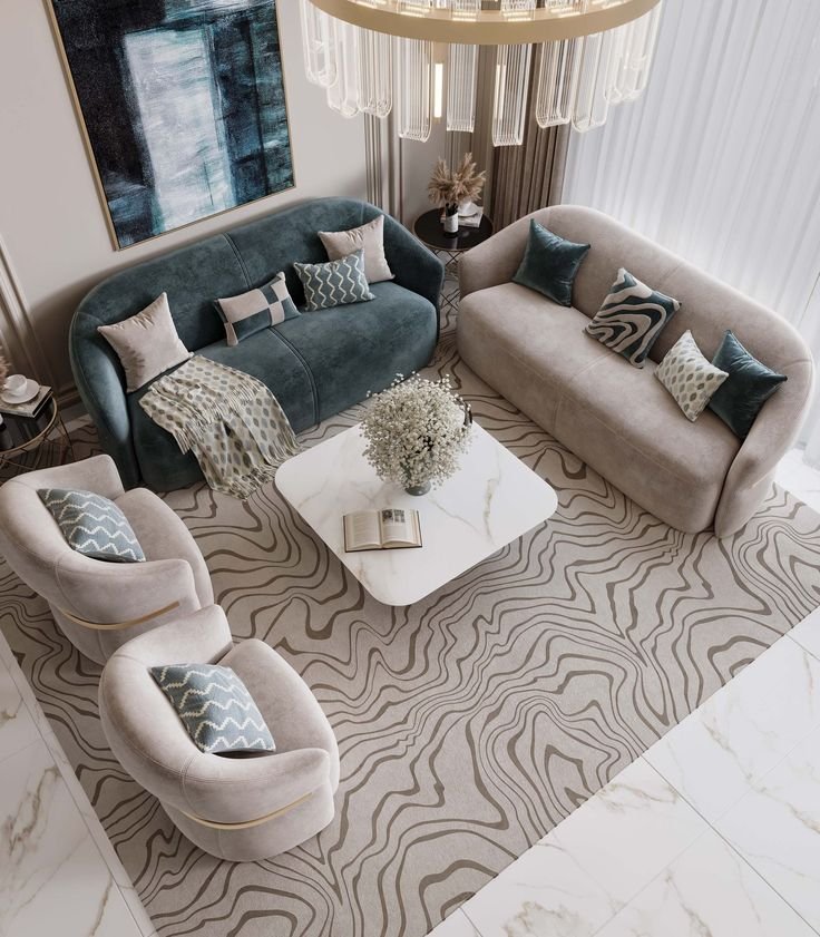 Elegant emerald and beige sofa set with velvet finish, solid wood frame, and plush comfort for refined modern spaces.