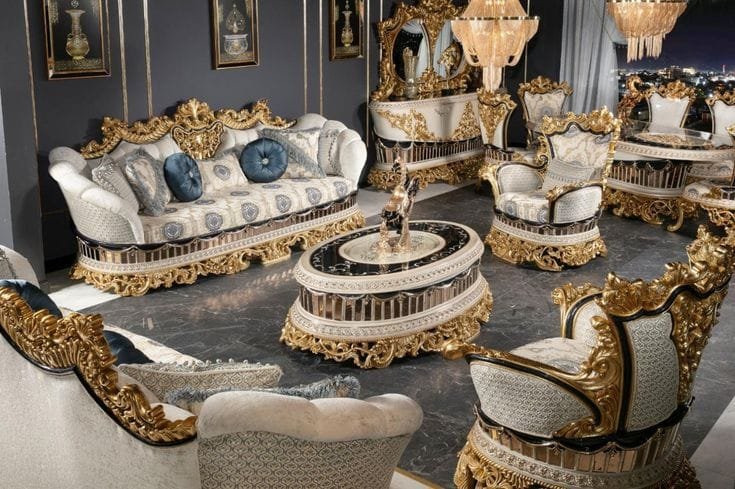 Elegant sapphire and gold living set with intricate carving, marble-top table, and luxurious patterned upholstery for a royal aesthetic.