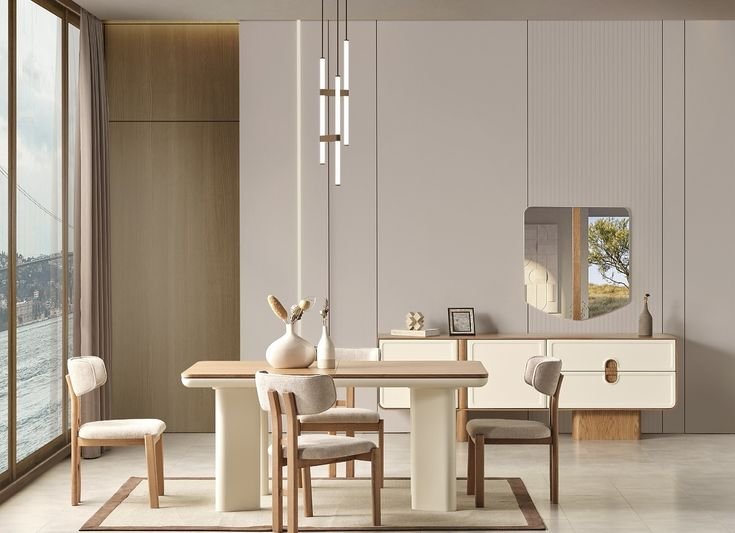 Modern beige and natural wood dining set with buffet, crafted from treated wood with matte finishing and elegant minimalist design.