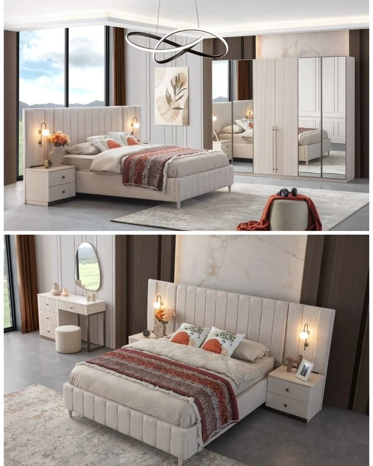 This elegant modern bedroom set is crafted from the finest high-density engineered wood, ensuring strength, durability, and a flawless surface with no gaps. Designed for refined taste, it showcases soft cream tones, clean vertical panel details, and meticulous finishing that highlight superior craftsmanship.