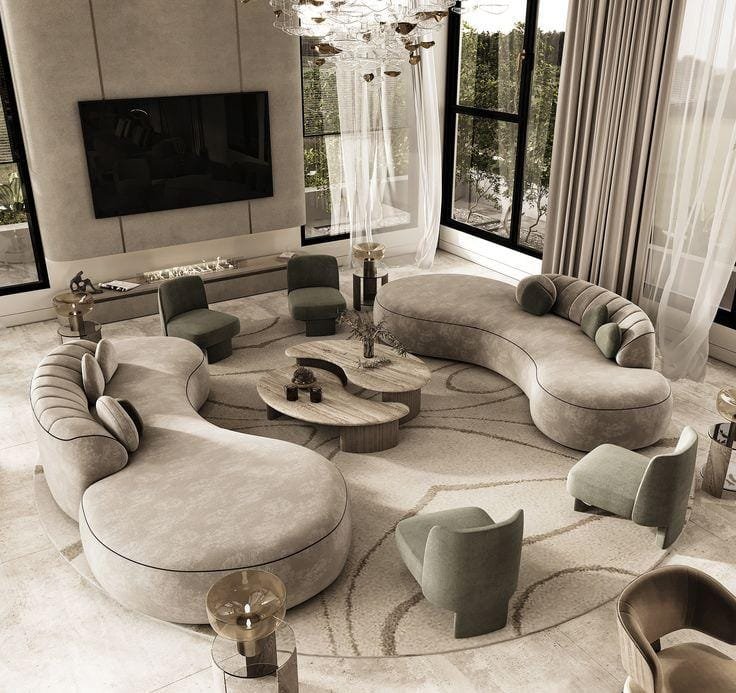 Luxurious curved sofa ensemble in soft velvet with fluid modern design, crafted for elegant and spacious living areas.