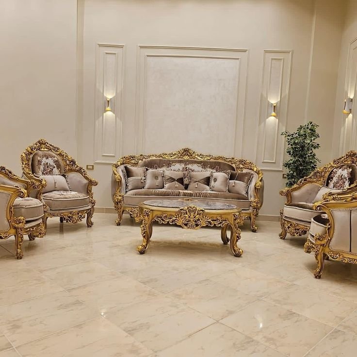 The Imperial Elegance Sofa Set showcases a perfect fusion of royal luxury and artisan precision. This refined collection includes a three-seater sofa, four grand armchairs, and a hand-carved coffee table, all crafted from premium kiln-dried red beech wood. The frame is adorned with hand-applied gold leaf carvings, finished with an antique patina that enhances its royal charm. The seating features high-density foam layered with memory foam, ensuring both elegance and lasting comfort. Upholstered in silky champagne velvet with floral embroidery, the design evokes a timeless classic aura. With its masterful detailing and rich golden tones, the Imperial Elegance set transforms any space into a palace of sophistication and grace.