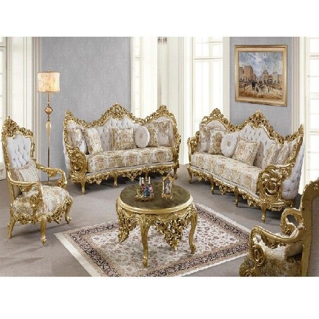 The Imperial Gold Majestic Living Set is a masterpiece of royal grandeur and luxury. It features a three-seater sofa, a two-seater sofa, two armchairs, and a round carved coffee table, all meticulously handcrafted from solid beech wood and coated with a rich 24K gold leaf finish. The set’s upholstery combines premium jacquard fabric with hand-tufted cushioning, creating an opulent aesthetic fit for palaces. Every curve and floral carving is finished with precision, making this set a symbol of elegance and timeless aristocratic design.