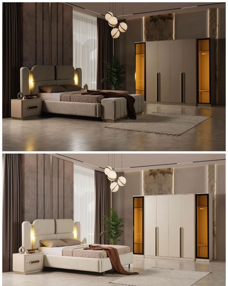 A premium beige and gold bedroom crafted from natural treated wood with elegant lighting and refined finishes.