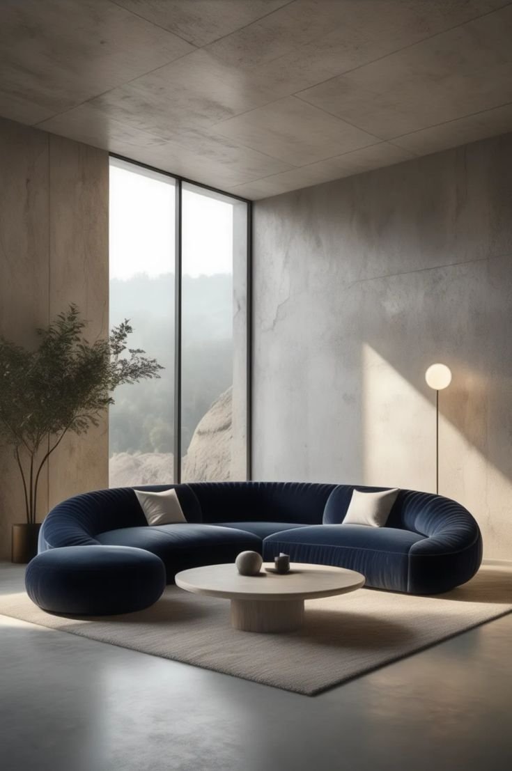 An elegant 350 cm curved sectional paired with a matching pouf, designed to transform any modern living space into a statement of sophistication. Upholstered in deep midnight-blue velvet, it offers plush comfort with a sculptural silhouette that enhances both luxury and relaxation. Ideal for open layouts, its bold yet minimal form blends seamlessly with contemporary interiors.