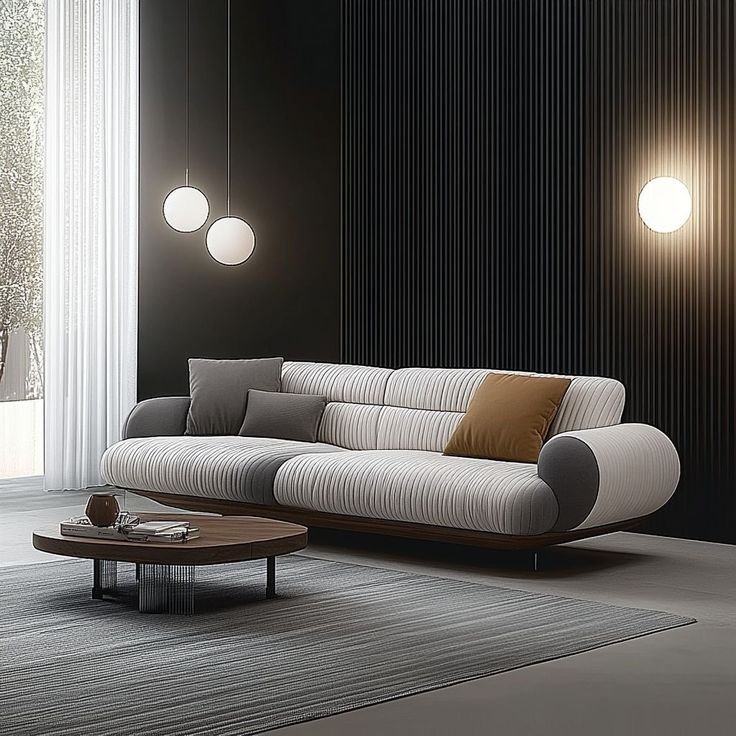 A striking 250 cm sofa that blends modern artistry with ultimate comfort. Featuring a dual-tone fabric design in soft beige and charcoal grey, this piece rests on a sleek wooden base for a refined aesthetic. Its plush ribbed upholstery and rounded armrests create a bold yet cozy centerpiece that elevates any contemporary living space.