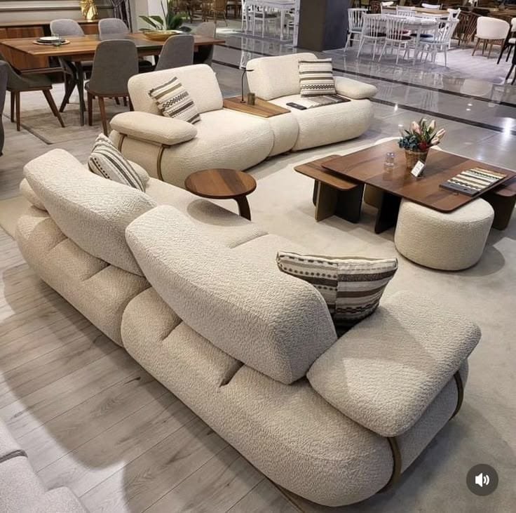 Contemporary sofa set in textured boucle fabric with wooden accents, combining comfort and timeless elegance for any modern living space.
