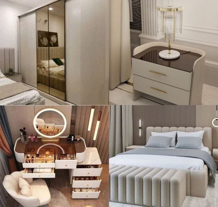 This elegant bedroom set is crafted from the finest treated natural wood and finished with world-class coatings and premium accessories. It combines modern aesthetics with functionality, featuring a soft upholstered bed, a smart vanity with integrated lighting, and a beautifully detailed wardrobe with golden accents.