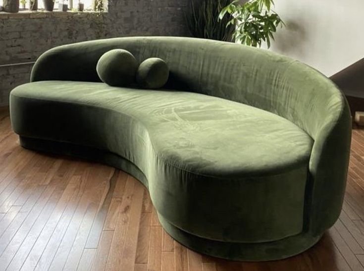 A curved olive velvet sofa with a sculptural design and plush modern comfort.