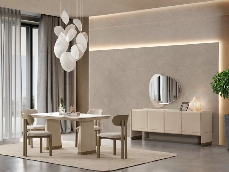 Elegant modern beige dining set with buffet, featuring matte finish, rounded design, and premium natural wood build.