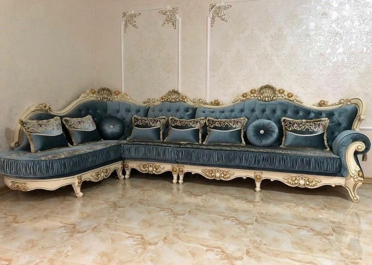 The Royal Azure Corner Sofa brings together timeless craftsmanship and refined luxury in a beautifully balanced design. Expertly constructed from premium kiln-dried red beech wood, this elegant piece measures 200×300 cm, making it ideal for spacious living areas. The sofa is upholstered with high-density foam enhanced by memory foam layers, offering a plush yet supportive seating experience. Its rich blue velvet fabric is complemented by hand-applied English and French gold leaf detailing, accentuating the intricate carvings and curved silhouette of the frame. With floral embroidery and tufted backrest detailing, the Royal Azure Corner Sofa captures the essence of royal comfort and classic sophistication.