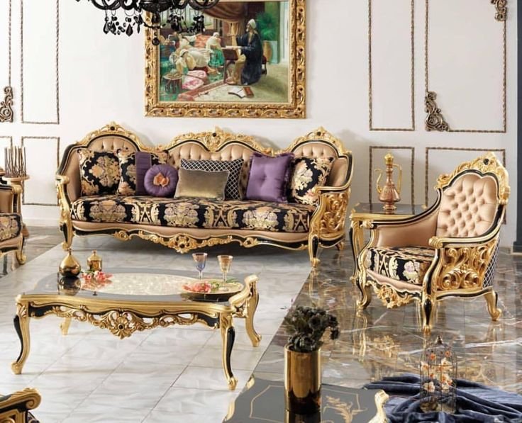Elegant royal sofa set crafted from red beech wood with memory foam comfort, gold leaf detailing, and refined black and champagne tones for a timeless luxury feel.