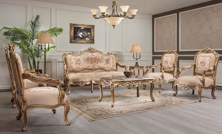 Elegant French-style living set with floral fabric, antique gold carvings, and marble-top table.