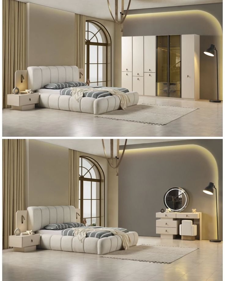 A luxurious modern bedroom set crafted from the finest treated natural wood, featuring a fully upholstered bed with smooth curves and soft fabric for ultimate comfort. The minimal design, neutral tones, and integrated lighting details create an elegant and relaxing atmosphere.