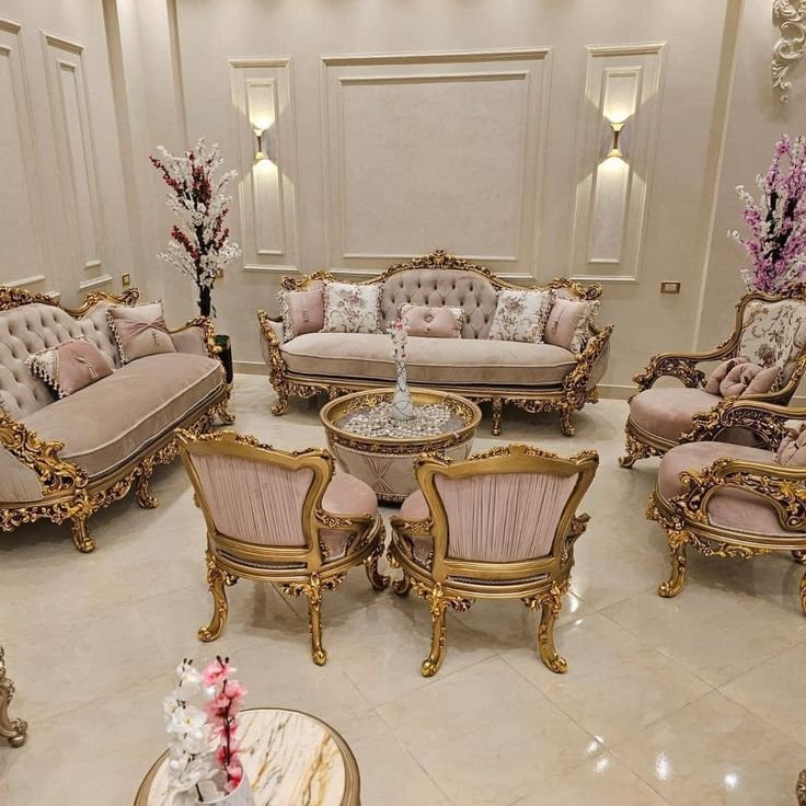 Elegant blush and gold living set with velvet upholstery, floral cushions, and a marble-top table — the perfect harmony of softness and royal sophistication.