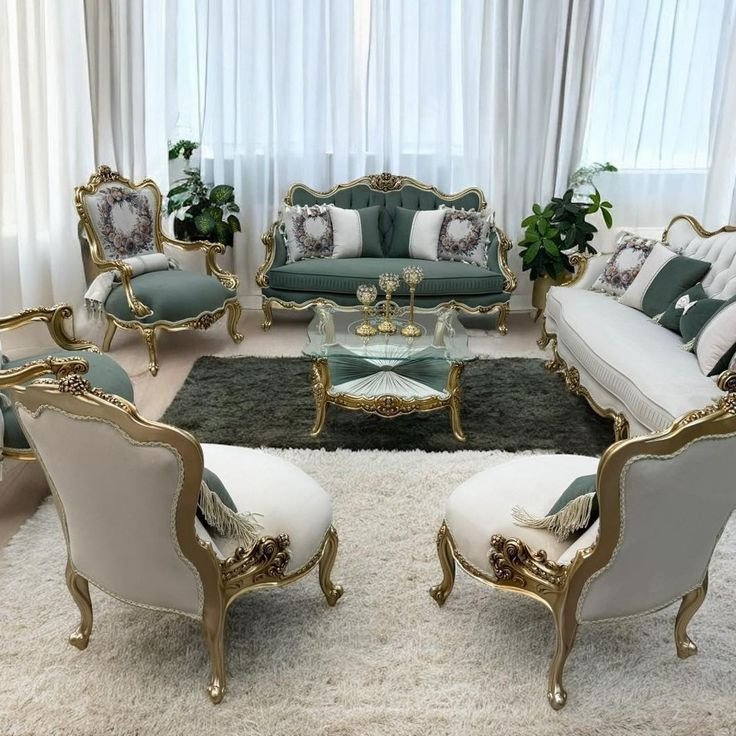 The Emerald Grace Living Set combines classic European craftsmanship with serene modern tones. This refined collection features a sofá de três lugares, a sofá de dois lugares, four elegant armchairs, e um glass-top carved coffee table, all constructed from premium beech wood with a hand-applied gold finish. The upholstery blends velvet and linen textures in deep emerald green and ivory white, enhanced by floral embroidered cushions for a sophisticated look. Each piece showcases intricate hand-carved detailing, soft tufting, and elegant curves that highlight royal artistry. The glass-top table with gold ornamentation adds a contemporary touch, making this set a centerpiece of luxury and comfort for refined living spaces.