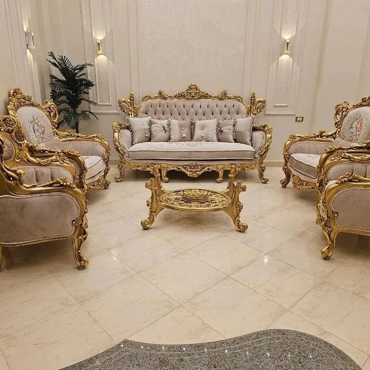 Luxurious beige and gold living set with velvet upholstery, baroque carvings, and a marble-top table — a perfect fusion of royal elegance and comfort.