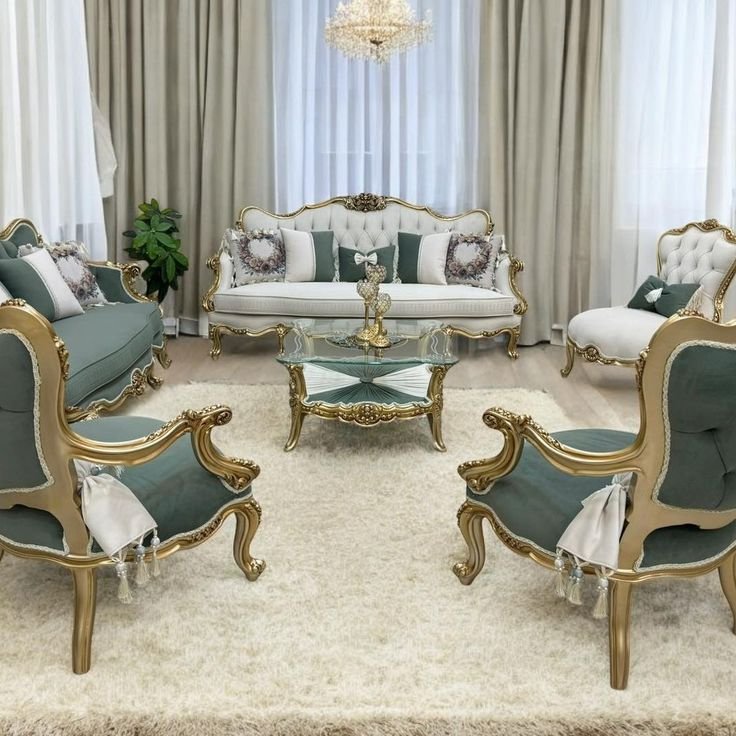 Luxurious emerald and ivory living set with gold accents, floral cushions, and a crystal glass-top table — a seamless blend of royal charm and modern elegance.