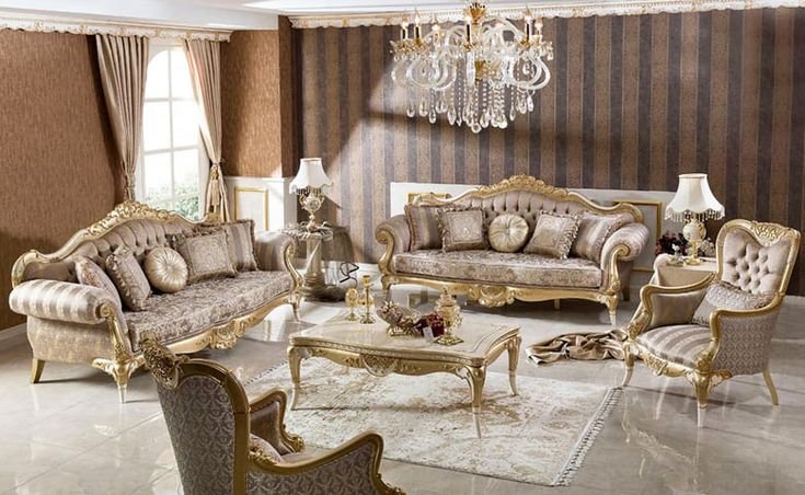 Luxurious gold jacquard living set with ornate carvings and plush cushions for a royal and inviting ambiance.