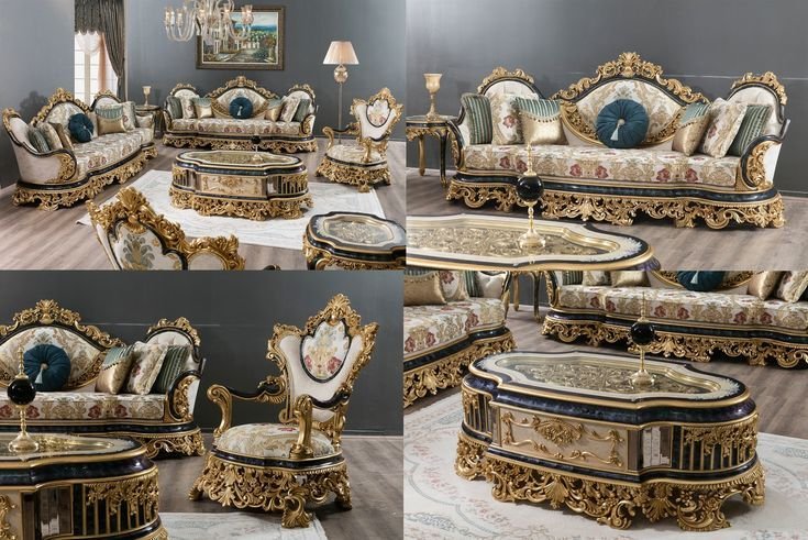 The Royal Renaissance Sofa Set redefines majestic living with its exquisite artistry and timeless allure. Meticulously handcrafted from madeira de faia vermelha de primeira qualidade seca em estufa, this magnificent collection includes a sofá de três lugares, a sofá de dois lugares, duas poltronas reais, e um lavishly sculpted center table. Cada peça é estofada com espuma de alta densidade reforçada por camadas de espuma viscoelástica, ensuring lasting comfort and superior support. The design is enriched with Pormenores em folha de ouro inglês e francês, meticulously hand-applied to the intricate carvings that frame the elegant curves. The combination of floral-patterned fabrics, deep blue accents, and baroque-inspired motifs evokes the grandeur of classical palaces, making this set a statement of refinement and royal sophistication in any interior.